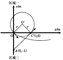 在水平光滑的絕緣桌面內建立如圖所示的直角坐標系,將第Ⅰ、Ⅱ象限稱為區(qū)域一,第Ⅲ、Ⅳ象限稱為區(qū)域二,其中一個區(qū)域內只有勻強電場,另一個區(qū)域內只有大小為2×10-2T、方向垂直桌面的勻強磁場.把一個比荷為2×108C/kg的正電荷從坐標為(0,-l)的A點處由靜止釋放,電荷以一定的速度從坐標為(1,0) 的C點第一次經x軸進入?yún)^(qū)域一,經過一段時間,從坐標原點O再次回到區(qū)域二。