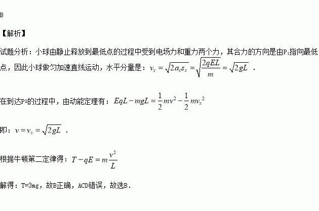 如圖所示,豎直平面內(nèi),一帶正電的小球,系于長為L的不可伸長的輕線一端,線的另一端固定為O點,它們處在勻強電場中,電場的方向水平向右,場強的大小為E。已知電場對小球的作用力的大小等于小球的重力。現(xiàn)先把小球拉到圖中的P1處,使輕線伸直,并與場強方向平行,然后由靜止釋放小球。已知小球在經(jīng)過最低點的瞬間,因受線的拉力作用,其速度的豎直分量突變?yōu)榱,水平分量沒有變化,(不計空氣阻力)則小球到達與P1點等高的P2點時線上張力T為多少( )