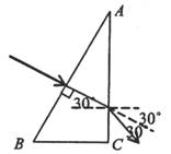 (8分)如圖所示,有一個(gè)玻璃三棱鏡ABC,其頂角A為30°。一束光線沿垂直于AB面的方向射入棱鏡后又由AC面射出,并進(jìn)入空氣。測(cè)得該射出光線與入射光線的延長(zhǎng)線之間的夾角為30°,求此棱鏡的折射率n。