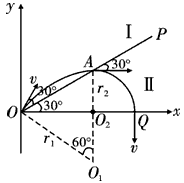 ,第一象限內(nèi)有兩個(gè)方向都垂直紙面向外的勻強(qiáng)磁場(chǎng)區(qū)域Ⅰ和Ⅱ,直線OP是他們的邊界,OP上方區(qū)域Ⅰ中磁場(chǎng)的磁感應(yīng)強(qiáng)度為B。一質(zhì)量為m,電荷量為q的質(zhì)子(不計(jì)重力)以速度v從O點(diǎn)沿與OP成