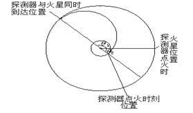 (題中信息:“從地面向火星發(fā)射火星探測器的兩個步驟……”,表明:為使探測器落到火星上,必須選擇適當時機點燃探測器上的發(fā)動機,使探測器沿橢圓軌道到達火星軌道的相切點,同時,火星也恰好運行到該點,為此必須首先確定點燃時刻兩者的相對位置)因探測器在地球公轉軌道運行周期