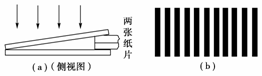 劈尖干涉是一種薄膜干涉,其裝置如圖(a)所示。將一塊平板玻璃放置在另一平板玻璃之上,在一端夾入兩張紙片,從而在兩玻璃表面之間形成一個劈形空氣薄膜。當(dāng)光垂直入射后,從上往下看到的干涉條紋如圖(b)所示,干涉條紋有如下特點(diǎn):(1)任意一條明條紋或暗條紋所在位置下面的薄膜厚度相等;(2)任意相鄰明條紋或暗條紋所對應(yīng)的薄膜厚度差恒定。現(xiàn)若在圖(a)裝置中抽去一張紙片,則當(dāng)光垂直入射到新的劈形空氣薄膜后,從上往下觀察到的干涉條紋( )
