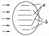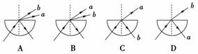 一復(fù)色光中只含有a、b兩種單色光,用該復(fù)色光照射一豎直理想透明薄膜(膜層厚度從零開始,上薄下厚)時,得到如圖所示的干涉圖樣。若用此復(fù)色光通過玻璃半球射向空氣,下列四個光路圖中可能符合實(shí)際情況的是( )