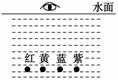如圖所示,在水面下同一深度并排緊挨著放置分別能發(fā)出紅光、黃光、藍(lán)光和紫光的四個燈泡,一人站在這四盞燈正上方離水面有一定距離處觀察,他感覺離水面最近的那盞燈發(fā)出的光是( )