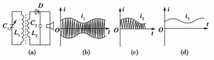 圖中(a)為一個調(diào)諧接收電路,圖(b)、圖(c)、圖(d)為電路中的電流隨時間變化的圖象,則( )