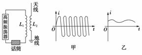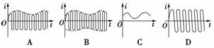 實際發(fā)射無線電波的過程如圖所示。高頻振蕩器產(chǎn)生高頻等幅振蕩如圖甲所示,人對著話筒說話時產(chǎn)生低頻信號如圖乙所示。根據(jù)以上圖象,發(fā)射出去的電磁波圖象應(yīng)是選項中哪一個( )