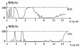 紅外遙感衛(wèi)星通過接收地面物體發(fā)出的紅外輻射來探測地面物體的狀況。地球大氣中的水汽(H2O)、二氧化碳(CO2)能強(qiáng)烈吸收某些波長范圍的紅外輻射,即地面物體發(fā)出的某些波長的電磁波,只有一部分能夠通過大氣層被遙感衛(wèi)星接收。下圖為水和二氧化碳對某一波段不同波長電磁波的吸收情況,由圖可知,在該波段紅外遙感大致能夠接收到的波長范圍為( )