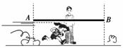 如圖所示,你站在水平木桿AB的中央附近,并且看到木桿落在地面上時是兩端同時著地的,所以,你認為這木桿是平著落到了地面上;若此時飛飛小姐正以接近光速的速度從你前面掠過,她看到B端比A端先落地,因而她認為木桿是向右傾斜著落地的。她的看法是( )