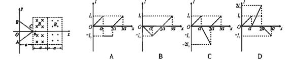 如圖所示,兩個垂直紙面的勻強磁場方向相反。磁感應(yīng)強度的大小均為B,磁場區(qū)域的寬度為a,一正三角形(高度為a)導(dǎo)線框ABC從圖示位置沿圖示方向勻速穿過兩磁場區(qū)域,以逆時針方向為電流的正方向,在下圖中感應(yīng)電流I與線框移動距離x的關(guān)系圖正確的是( )