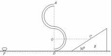 如圖所示,用內(nèi)壁光滑的薄壁細(xì)管彎成的“S”形軌道固定于豎直平面內(nèi),其彎曲部分是由兩個(gè)半徑均為R的半圓平滑對(duì)接而成(圓的半徑遠(yuǎn)大于細(xì)管內(nèi)徑),軌道底端D點(diǎn)與粗糙的水平地面相切,F(xiàn)一輛玩具小車m以恒定的功率從P點(diǎn)開(kāi)始行駛,經(jīng)過(guò)一段時(shí)間t之后,出現(xiàn)了故障,發(fā)動(dòng)機(jī)自動(dòng)關(guān)閉,小車在水平地面繼續(xù)運(yùn)動(dòng)并進(jìn)入“S”形軌道,從軌道的最高點(diǎn)A水平飛出后,恰好垂直撞在固定斜面B上的C點(diǎn),C點(diǎn)與下半圓的圓心等高。已知小車與地面之間的動(dòng)摩擦因數(shù)為μ,PD之間的距離為x0,斜面的傾角為30º。求: