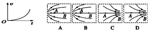 一負(fù)電荷從電場(chǎng)中A點(diǎn)由靜止釋放,只受電場(chǎng)力作用,沿電場(chǎng)線運(yùn)動(dòng)到B點(diǎn),它運(yùn)動(dòng)的速度—時(shí)間圖象如右圖所示.則A、B兩點(diǎn)所在區(qū)域的電場(chǎng)線分布情況可能是下圖中的 ( )