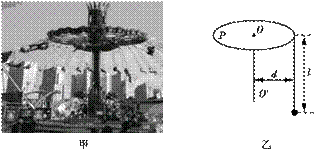 圖甲為游樂園中“空中飛椅”的游戲設(shè)施,它的基本裝置是將繩子上端固定在轉(zhuǎn)盤的邊緣上,繩子的下端連接座椅,人坐在座椅上隨轉(zhuǎn)盤旋轉(zhuǎn)而在空中飛旋.若將人和座椅看成一個質(zhì)點,則可簡化為如圖乙所示的物理模型,其中P為處于水平面內(nèi)的轉(zhuǎn)盤,可繞豎直轉(zhuǎn)軸OO'轉(zhuǎn)動,設(shè)繩長l=10 m,質(zhì)點的質(zhì)量m=60 kg,轉(zhuǎn)盤靜止時質(zhì)點與轉(zhuǎn)軸之間的距離d=4.0 m,轉(zhuǎn)盤逐漸加速轉(zhuǎn)動,經(jīng)過一段時間后質(zhì)點與轉(zhuǎn)盤一起做勻速圓周運動,此時繩與豎直方向的夾角θ=37°,不計空氣阻力及繩重,且繩不可伸長,sin 37°=0.6,cos 37°=0.8,g=10 m/s2,求質(zhì)點與轉(zhuǎn)盤一起做勻速圓周運動時: