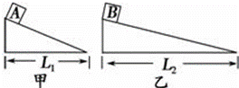 水平地面上有兩個固定的、高度相同的粗糙斜面甲和乙,底邊長分別為L1、L2,且L1<L2,如圖所示.兩個完全相同的小滑塊A、B(可視為質(zhì)點)與兩個斜面間的動摩擦因數(shù)相同,將小滑塊A、B分別從甲、乙兩個斜面的頂端同時由靜止開始釋放,取地面所在的水平面為參考平面,則( 。