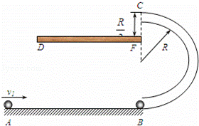 如圖所示,一質(zhì)量m1=0.2kg的小球,從光滑水平軌道上的一端A處,以v1=2.5m/s的速度水平向右運動.軌道的另一端B處固定放置一豎直光滑半圓環(huán)軌道(圓環(huán)半徑比細管的內(nèi)徑大得多),軌道的半徑R=10cm,圓環(huán)軌道的最低點與水平軌道相切;空中有一固定長為15cm的木板DF,F(xiàn)在軌道最高點C的正下方,豎直距離為5cm.水平軌道的另一端B處有一質(zhì)量m2=0.2kg的小球,m1、m2兩小球在B處發(fā)生的是完全彈性碰撞,重力加速度為g=10m/s2,求:
