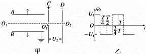 如圖甲所示,A、B是兩水平放置的足夠長的平行金屬板,組成偏轉勻強電場,B板接地.A板電勢φA隨時間變化情況如圖乙所示,C、D兩平行金屬板豎直放置,中間有正對兩孔O1′和O2,兩板間電壓為U2,組成減速電場.現有一帶負電粒子在t=0時刻以一定初速度沿AB兩板間的中軸線O1O1′進入,并能從O1′沿O1′O2進入C、D間,剛好到達O2孔,已知帶電粒子帶電荷量為﹣q,質量為m,不計其重力.求: