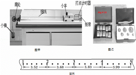 (1)小組同學(xué)按圖甲所示安裝好裝置后,將軌道右端適當(dāng)墊起,來平衡阻力.請指出不合理之處 平衡摩擦力時不能掛著小桶、砝碼。_操作后,小組同學(xué)在小桶里加適當(dāng)?shù)奈矬w,拉動小車加速運動.在小桶里逐漸增加物體改變拉力大小,所加物體應(yīng)選用如圖乙中的 砝碼。ㄌ顚嵨锩Q).