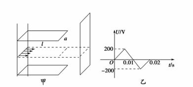 一平行板電容器長l=10 cm,寬a=8 cm,板間距d=4 cm,在板左側有一足夠長的“狹縫”離子源,沿著兩板中心平面,連續(xù)不斷地向整個電容器射入離子,它們的比荷均為2×1010 C/kg,速度均為4×106 m/s,距板右端l/2處有一屏,如圖甲所示,如果在平行板電容器的兩極板間接上如圖乙所示的交流電,由于離子在電容器中運動所用的時間遠小于交流電的周期,故離子通過電場的時間內電場可視為勻強電場,不計離子重力.試求: