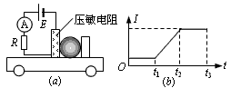 壓敏電阻的阻值隨所受壓力的增大而減小,有位同學(xué)利用壓敏電阻設(shè)計(jì)了判斷小車運(yùn)動(dòng)狀態(tài)的裝置,其工作原理如圖(a)所示。將壓敏電阻和一塊擋板固定在絕緣小車上,中間放置一個(gè)絕緣重球。小車向右做直線運(yùn)動(dòng)過(guò)程中,電流表示數(shù)如圖(b)所示。下列判斷正確的是