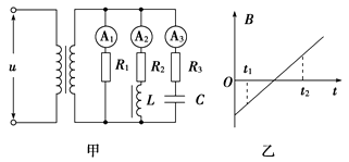 圖甲所示電路中,A1、A2、A3為相同的電流表,C為電容器,電阻R1、R2、R3的阻值相同,線圈L的電阻不計(jì).在某段時(shí)間內(nèi)理想變壓器原線圈內(nèi)磁場(chǎng)的變化如圖乙所示,則在t1~t2時(shí)間內(nèi),下列說(shuō)法錯(cuò)誤的是