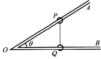 如圖所示,水平放置的兩固定光滑硬桿OA、OB成θ角,在兩桿上各套一輕環(huán)P、Q,兩環(huán)用細繩相連.現(xiàn)用一大小為F的恒力沿OB方向拉圓環(huán)Q,當兩環(huán)處于平衡狀態(tài)時,繩子的拉力大小為______.【4】
