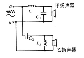 “二分頻”音箱內(nèi)有兩個不同口徑的揚聲器,它們的固有頻率分別處于高音、音低頻段,分別稱為高音揚聲器和低音揚聲器.音箱要將擴音機送來的含有不同頻率的混合音頻電流按高、低頻段分離出來,送往相應(yīng)的揚聲器,以便使電流所攜帶的音頻信息按原比例還原成高、低頻的機械振動.圖為音箱的電路圖,高、低頻混合電流電a、b端輸入,L1和L2是線圈,C1和C2是電容器( )