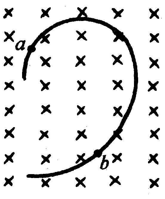 一個帶電粒子,沿垂直于磁場的方向射入一勻強磁場,粒子的一段徑跡如圖所示,徑跡上的每一小段都可近似看成圓弧,由于帶電粒子使沿途的空氣電離,粒子的能量逐漸減小(帶電量不變)從圖中情況可以確定( )