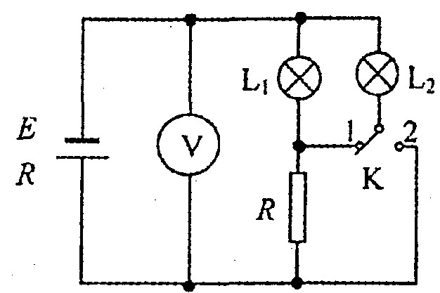 如圖所示的電路中,電源電動(dòng)勢為E,內(nèi)阻為R,L1和L2為相同的燈泡,每個(gè)燈泡的電阻和定值電阻相同,阻值均為R,電壓表為理想電表,K為單刀雙擲開關(guān),當(dāng)開關(guān)由1位置打到2位置時(shí) ( )