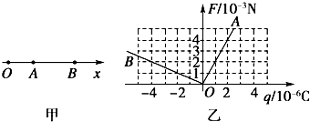 如圖甲所示,O、A、B為的三點,x軸上某點有一點電荷,在研究試探電荷所受電場力跟所帶電荷量的關(guān)系時,利用測得的數(shù)據(jù)畫出A、B兩點的F-q圖象,如圖乙所示,電場力的正方向與x軸正方向一致,但實驗時忘記了驗證場源點電荷的電性,也忘記了記下場源點電荷在x軸上的具體位置,請分析判斷場源點電荷的電性、所處位置及A、B兩點電勢高低.