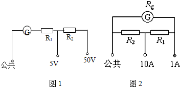 (1)如圖1所示,有一個表頭G,滿偏電流為Ig=1mA,內阻Rg=100Ω,用它改裝為有5V和50V兩種量程的電壓表,則R1=