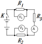 如圖所示的電路中,當電鍵K閉合后,電流表A的示數(shù)為零,電壓表V1的示數(shù)為6V,電壓表V2的示數(shù)為零.導線、電表、電鍵及各接線處均無問題,這說明斷路的是( 。