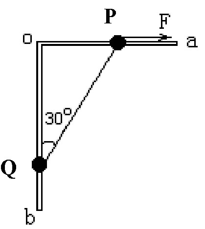 光滑的直角細(xì)桿aob 固定在豎直平面內(nèi),oa桿水平,ob桿豎直。有兩個質(zhì)量均為m的小球P與Q分別穿在oa 、ob桿上,兩球用一輕繩連接。兩球在水平拉力F作用下處于靜止?fàn)顟B(tài),繩與ob桿的夾角為30°,如圖所示。P球?qū)a桿的壓力大小為________,水平拉力F的大小為________。