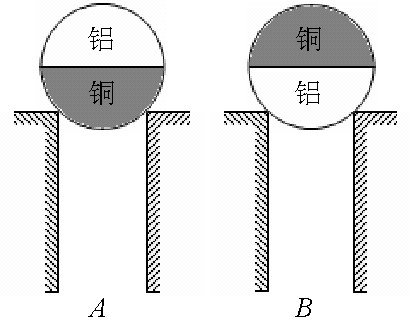 兩個相同的實心金屬球均是由一半的鋁和一半的銅做成的,現(xiàn)將它們擱置在支架上,如圖所示,A圖金屬球銅部分向下放置,B圖金屬球鋁部分向下放置,則支架頂端對金屬球的支持力