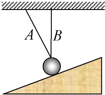 如圖所示,一個金屬小球靜止在光滑斜面上,球上有兩根細(xì)繩A、B懸于水平天花板,B繩處于豎直位置,則下列說法正確的是 [ ]