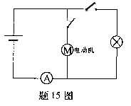 汽車電動機(jī)啟動時車燈會瞬時變暗,如圖15圖,在打開車燈的情況下,電動機(jī)未啟動時電流表讀數(shù)為10 A,電動機(jī)啟動時電流表讀數(shù)為58 A,若電源電動勢為12.5 V,內(nèi)阻為