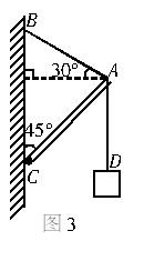 如圖3所示,C點(diǎn)為光滑轉(zhuǎn)軸,繩AB能承受的最大拉力值為1000N,桿AC能承受的最大壓力值為2000N,在A點(diǎn)最多能懸掛多重的物體?(繩、桿自重不計(jì))
