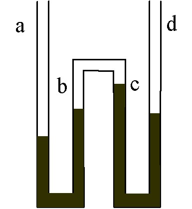 圖示為由粗細(xì)均勻的細(xì)玻璃管彎曲成的“雙U形管”,a、b、c、d為其中四段豎直的部分,其中a、d上端是開口的,處在大氣中,管中的水銀把一段氣柱密封在b、c內(nèi),達(dá)到平衡時(shí),管內(nèi)水銀面的位置如圖所示.現(xiàn)緩慢地降低氣柱中氣體的溫度,若c中的水銀上升了一小段高度Δh,則