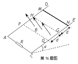 (16分)如圖所示,兩平行光滑的金屬導軌AD、CE相距L=1.0m,導軌平面與水平面的夾角α=30°,下端用導線連接R=0.40Ω的電阻,導軌電阻不計.PQGH范圍內(nèi)存在方向垂直導軌平面的磁場,磁場的寬度d=0.40m,邊界PQ、HG均與導軌垂直.質(zhì)量m=0.10kg、電阻r=0.10Ω的金屬棒MN垂直放置在導軌上,且兩端始終與導軌電接觸良好,從與磁場上邊界GH距離也為d的位置由靜止釋放,取g=10m/s2