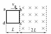 如圖所示,邊長為L、總電阻為R的正方形線框abcd放置在光滑水平桌面上,其bc邊緊靠磁感強度為B、寬度為2L、方向豎直向下的有界勻強磁場的邊緣。現(xiàn)使線框以初速度