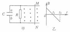 如圖甲所示,水平放置的平行金屬導(dǎo)軌連接一個(gè)平行板電容器C和電阻R,導(dǎo)體棒MN放在導(dǎo)軌上且接觸良好,整個(gè)裝置放于垂直導(dǎo)軌平面的磁場(chǎng)中,磁感應(yīng)強(qiáng)度B的變化情況如圖乙所示(圖示磁感應(yīng)強(qiáng)度方向?yàn)檎,MN始終保持靜止,則0~t2時(shí)間( )
