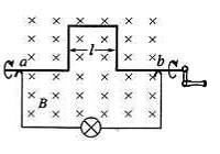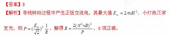 (2013山東青島二中測(cè)試)將硬導(dǎo)線中間一段折成不封閉的正方形,每邊長(zhǎng)為l,它在磁感應(yīng)強(qiáng)度為B、方向如圖所示的勻強(qiáng)磁場(chǎng)中勻速轉(zhuǎn)動(dòng),轉(zhuǎn)速為n,導(dǎo)線在a、b兩處通過電刷與外電路連接,外電路接有額定功率為P的小燈泡并正常發(fā)光,電路中除燈泡外,其余部分的電阻不計(jì),燈泡的電阻應(yīng)為 ( )