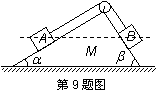 (2013南通第一次調(diào)研).如圖所示,一個(gè)表面光滑的斜面體M置于在水平地面上,它的兩個(gè)斜面與水平面的夾角分別為a、b,且a <b,M的頂端裝有一定滑輪,一輕質(zhì)細(xì)繩跨過定滑輪后連接A、B兩個(gè)小滑塊,細(xì)繩與各自的斜面平行,不計(jì)繩與滑輪間的摩擦,A、B恰好在同一高度處于靜止?fàn)顟B(tài).剪斷細(xì)繩后,A、B滑至斜面底端,M始終保持靜止.則