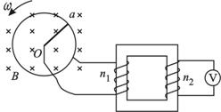 =10rad/s勻速轉(zhuǎn)動,圓環(huán)處于垂直于環(huán)面,磁感應(yīng)強(qiáng)度為B=2T的勻強(qiáng)磁場中。從圓心O引出導(dǎo)線,從圓環(huán)上接出導(dǎo)線,并接到匝數(shù)比為n1:n2=1:4的理想變壓器原線圈兩端。則接在副線圈兩端的理想電壓表的示數(shù)為