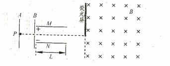 (2013山東省即墨市期末)如圖所示,位于A板附近的放射源P連續(xù)釋放出質(zhì)量分別為m和2m、電荷量均為+q的a、b兩種粒子,它們從靜止開始經(jīng)極板A、B間電場加速后,沿中心軸線方向進入平行極板M、N間的偏轉(zhuǎn)電場,飛出偏轉(zhuǎn)電場后進入右側(cè)的有界勻強磁場,最后打在位于磁場邊界上的熒光屏上并產(chǎn)生光斑(熒光屏的下端位于中心軸線上).已知A、B問電壓為
