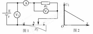 (2013湖北省襄陽市3月質(zhì)檢)電阻非線性變化的滑動變阻器R2接入圖1的電路中,移動滑動變阻器觸頭改變接入電路中的長度x(x為圖中a與觸頭之間的距離),定值電阻R1兩端的電壓U1與x間的關(guān)系如圖2,a、b、c為滑動變阻器上等間距的三個點,當(dāng)觸頭從a移到b和從b移到c的這兩過程中,下列說法正確的是