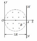 (2013湖南省婁底市期末)如圖所示,磁感應強度大小B =0.15T、方向垂直紙面向里的勻強磁場分布在半徑R =0.10m的圓形區(qū)域內,圓的左端跟y軸相切于直角坐標系原點O,右端跟很大的熒光屏MN相切于x軸上的A點。置于原點的粒子源可沿x軸正方向以不同的速度射出帶正電