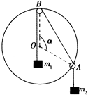 如圖所示,小圓環(huán)A系著一個(gè)質(zhì)量為m2的物塊并套在另一個(gè)豎直放置的大圓環(huán)上,有一細(xì)線一端拴在小圓環(huán)A上,另一端跨過固定在大圓環(huán)最高點(diǎn)B的一個(gè)小滑輪后吊著一個(gè)質(zhì)量為m1的物塊.如果小圓環(huán)、滑輪、繩子的大小和質(zhì)量以及相互之間的摩擦都可以忽略不計(jì),繩子又不可伸長(zhǎng),若平衡時(shí)弦AB所對(duì)應(yīng)的圓心角為α,則兩物塊的質(zhì)量比m1∶m2應(yīng)為( )![]()