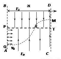 如圖所示,相距2L的AB、CD兩直線間的區(qū)域存在著兩個大小不同、方向相反的有界勻強電場,其中PT上方的電場E1的場強方向豎直向下,PT下方的電場E0的場強方向豎直向上,在電場左邊界AB上寬為L的PQ區(qū)域內(nèi),連續(xù)分布著電量為+q、質(zhì)量為m的粒子.從某時刻起由Q到P點間的帶電粒子,依次以相同的初速度v0沿水平方向垂直射入勻強電場E0中,若從Q點射入的粒子,通過PT上的某點R進入勻強電場E1后從CD邊上的M點水平射出,其軌跡如圖,若MT兩點的距離為L/2.不計粒子的重力及它們間的相互作用.試求: