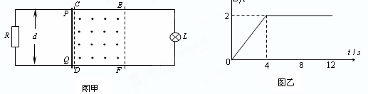 如圖甲所示,水平面上的兩光滑金屬導(dǎo)軌平行固定放置,間距d=0.5 m,電阻不計(jì),左端通過(guò)導(dǎo)線(xiàn)與阻值R=2 W的電阻連接,右端通過(guò)導(dǎo)線(xiàn)與阻值RL =4 W的小燈泡L連接.在CDEF矩形區(qū)域內(nèi)有豎直向上的勻強(qiáng)磁場(chǎng),CE長(zhǎng)l =2 m,有一阻值r =2 W的金屬棒PQ放置在靠近磁場(chǎng)邊界CD處.CDEF區(qū)域內(nèi)磁場(chǎng)的磁感應(yīng)強(qiáng)度B隨時(shí)間變化如圖乙所示.在t=0至t=4s內(nèi),金屬棒PQ保持靜止,在t=4s時(shí)使金屬棒PQ以某一速度進(jìn)入磁場(chǎng)區(qū)域并保持勻速運(yùn)動(dòng).已知從t=0開(kāi)始到金屬棒運(yùn)動(dòng)到磁場(chǎng)邊界EF處的整個(gè)過(guò)程中,小燈泡的亮度沒(méi)有發(fā)生變化,
