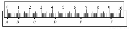 (6分)在做“研究勻變速直線運動”的實驗時,某同學(xué)得到一條用打點計時器打下的紙帶,并在其上取了A、B、C、D、E、F等6個計數(shù)點(每相鄰兩個計數(shù)點間還有4個打點計時器打下的點,本圖中沒有畫出)打點計時器接的是220V、50Hz的交變電流.他把一把毫米刻度尺放在紙帶上,其零刻度和計數(shù)點A對齊。