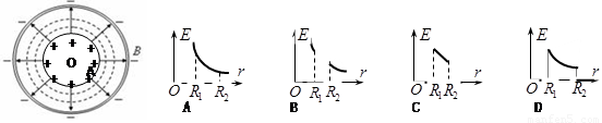 特定的電荷分布形成特定的電場(chǎng),雖然不一定能推導(dǎo)某些空間電場(chǎng)分布具體情況,但可以根據(jù)學(xué)過的知識(shí)進(jìn)行一定的分析和判斷。如圖6-1為兩個(gè)均勻帶電足夠長(zhǎng)的同軸柱面,軸心為O,半徑分別為R1、R2(R1<R2),小柱面帶電+Q,大柱帶電-Q,圖6-2中哪一個(gè)能正確地反映空間電場(chǎng)強(qiáng)度E的大小與距離軸心r之間的關(guān)系( )